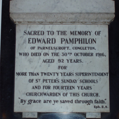 Edward Pamphilon was a Londoner who moved to Congleton from Fenton in the 1870s. He made his home at Parnellscroft, off Park Lane, now remembered in the name Parnells Square. He quickly became an active member of St Peter`s, as the “Chronicle” reported he gave impressive weekly readings from the Bible. For twenty years from 1884 he was superintendent of the Sunday Schools which met in the National School on the other side of Chapel Street. During his 14 year service as Church Warden he oversaw a number of internal changes, including replacing the original 18th century communion table with a wooden one as he understood that the marble topped table on its iron frame violated church furnishing regulations. (The marble top became a desk in the vestry and later a draining board next to the kitchen sink. It has been rescued and is stored in the side chapel!)