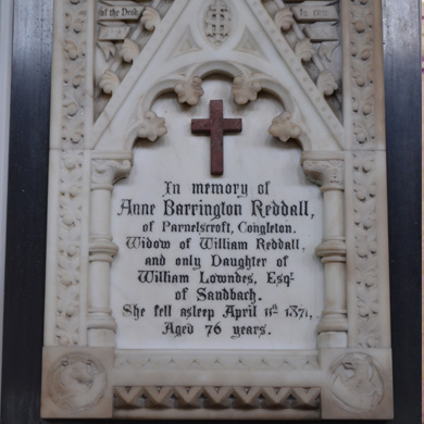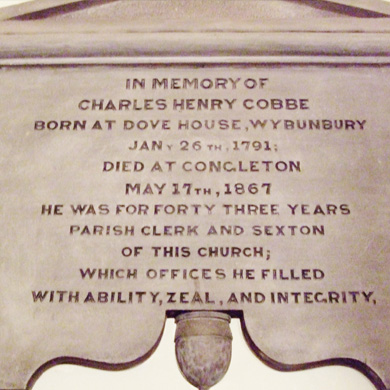 His memorial has an enigmatic line: “and he caused the widows heart to sing for joy”. This may be explained by the section of his will in which he left the annual profits of his eight shares in the Congleton Gas Company to provide for twenty poor women of the borough – provided that they were single, over fifty years old and not already receiving parochial aid. The Minister, the Minister`s Warden and the Schoolmaster were to make the distribution in St Peter`s Vestry on the 19th of December each year. He was owed £300 from the estate of William Lowndes because Faulkner had bought an estate for Ann Reddall who lived at Parnell`s Croft until her death, when it was purchased by Edward Pamphilon. (The memorials of Faulkner, Sutton, Cobbe, Reddall and Pamphilon are all in the church)