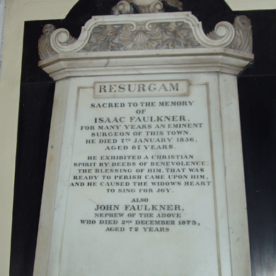 Isaac Faulkner was a surgeon who gathered round him a group of close friends: fellow surgeons, clergymen and mill owners. He settled in Congleton at the end of the reign of George III and had his practice on the High Street. The evidence of his success is shown in the long list of properties he left in his will: houses, shops, and land in the town – on the High Street, Lawton Street, Swan Bank, Mill Street; and on the outskirts – in Priesty Fields, Howey Lane and Bromley Lane. He had other property in Manchester and Burslem.